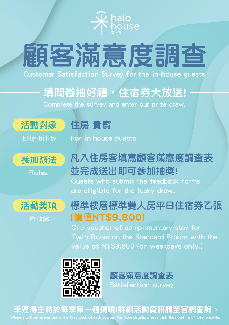 (7)本活動贈送的標準樓層高級客房/標準樓層標準雙人房平日住宿券無法於旺/假日加價使用,不含早餐,其他使用辦法請見券上說明。